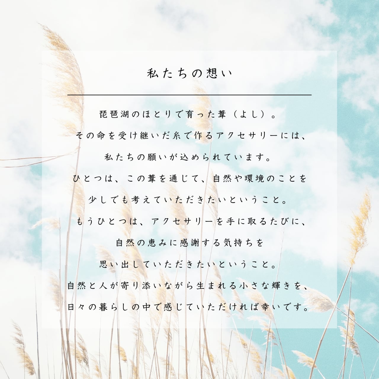 琵琶湖の葦(よし)から作られた、サスティナブルなアクセサリーとして、自然の恵みを大切に感じられる一品です。